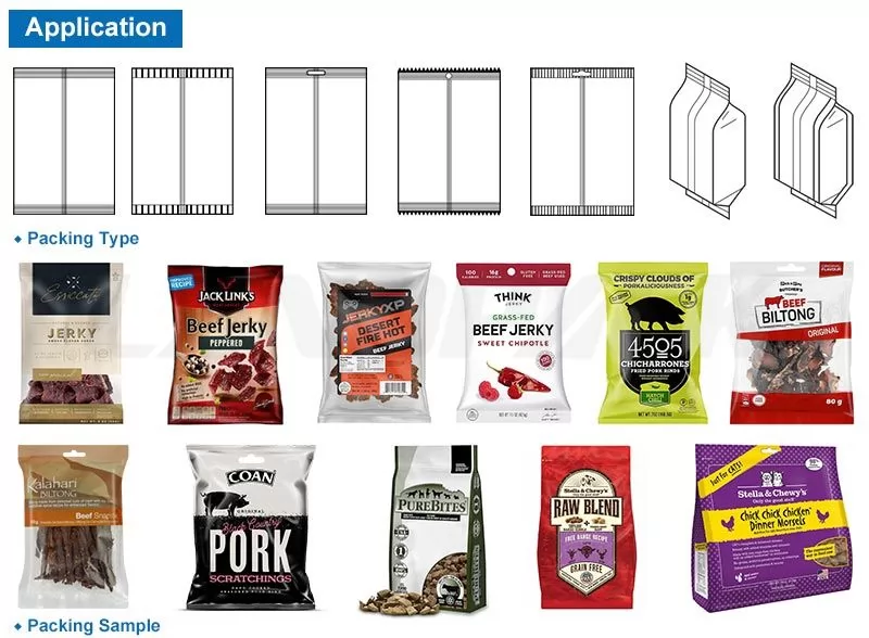● Application: Automatic Beef Jerky Packing Machine With Secondary feeding + weighing. It suitable for packaging in food, agriculture, pharmaceutical, cosmetics, chemical and other industries. such as beef jerky, biltong, chicken nuggets, snack foods, frozen foods, vegetables, fruits, candies, chemicals and other particles.