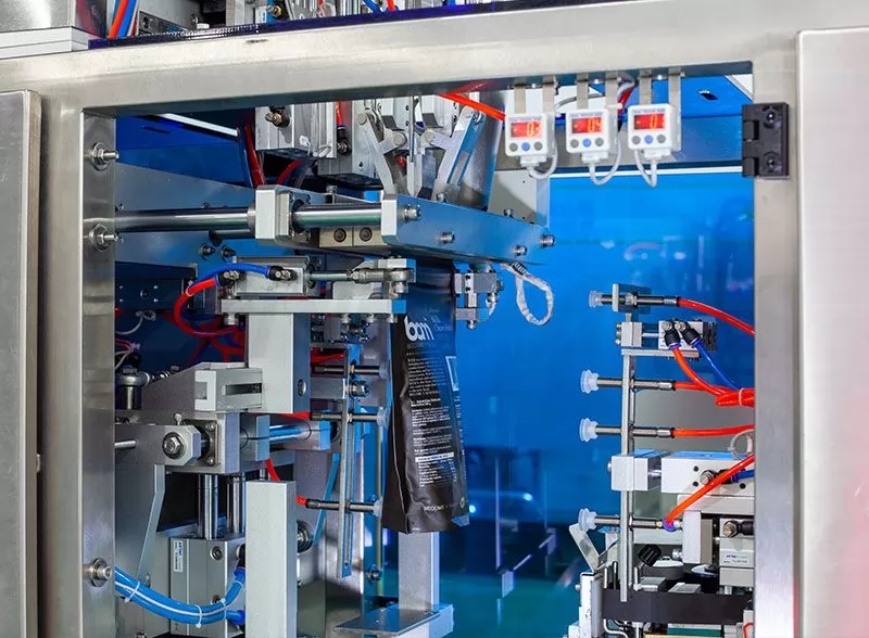 During filling, pouches are held in place with our "posi-hold" gripper system. This allows for heavy weights and shock loads