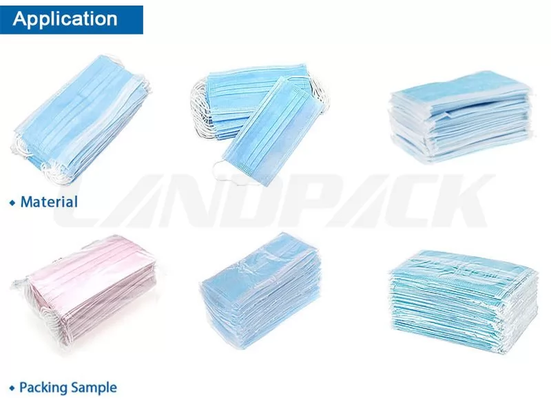 Application: Suitable for fully automatic packaging of multiple flat masкs, such as 5 pieces per pack, 10 pieces per ba, 15 pieces per pack, 20 pieces per pack, 30 pieces per pack, 50 pieces per pack, etc.
