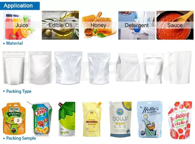 Pouch Type: All type of heat sealable preformed side seal bags, fin seal bags, gusseted bags, block bottom bags, zip-lock recloseable bags, stand-up pouch with or without spout ect.