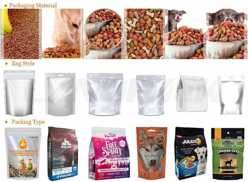 ●Suitable for automatic packing for grain and solid food, such as dog food, cat food, fish food, bird food, and other granular pet food, beans, nuts, dry fruits, candy, cereal, chocolate, biscuit, peanut, capsule, seeds, chemicals, sugar, etc..