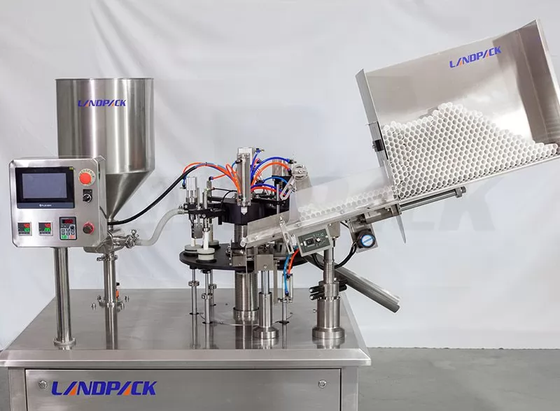 This machine applies the transmission principle. It uses the slot wheel dividing system to drive the conveyor table to do intermittent movement. The machine has 8 or 10 tube stations. Expect manually feeding the tubes onto the machine, it can automatically position the tubes, fill the material into the tubes, heat both inside and outside of the tubes, seal the tubes, press the codes, and trim the tails and the finished tubes exit.